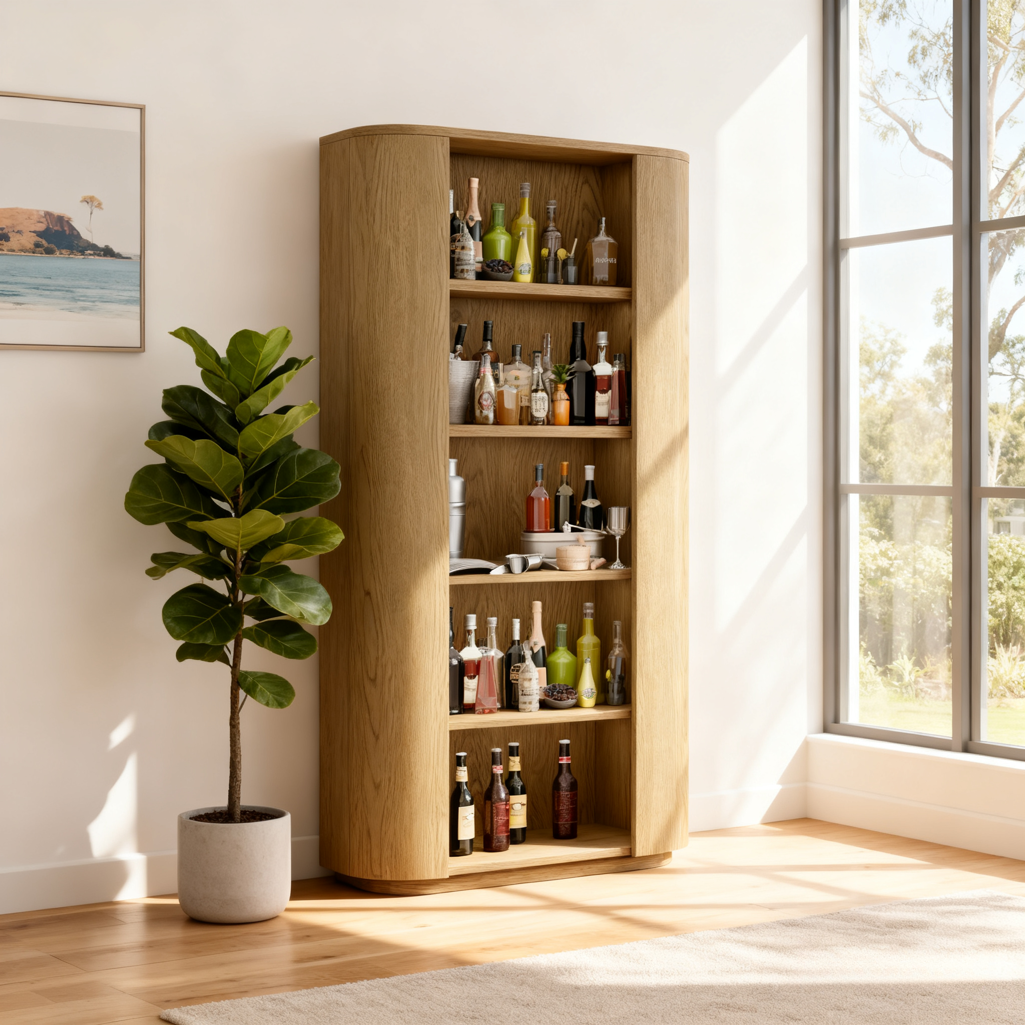 Featuring softly rounded edges and a clean vertical silhouette, this oak storage cabinet brings both elegance and warmth to any space. The natural wood grain enhances its texture, while the open shelving offers flexible display and storage — perfect for use as a bookshelf, display rack, or storage cabinet in living rooms, hotels, offices, or retail spaces.