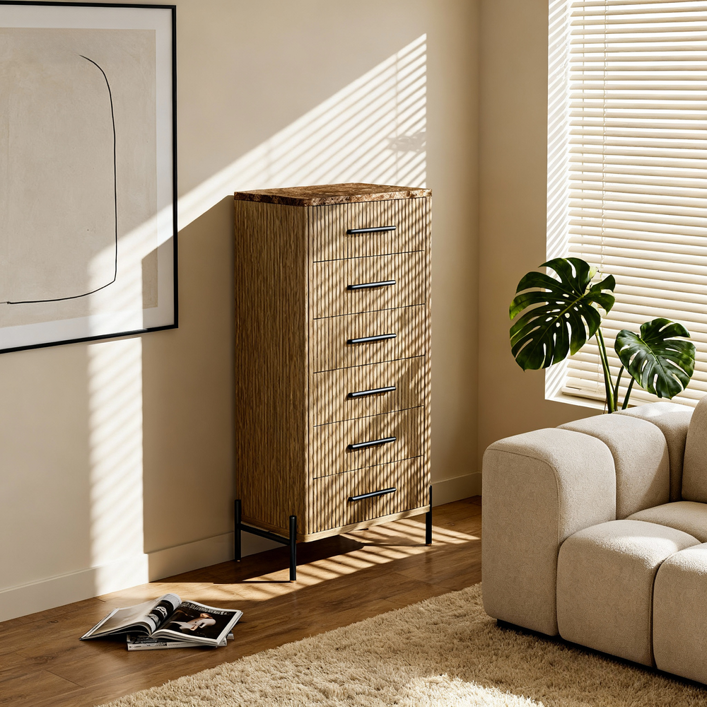 The tall chest is defined by its vertical proportions, offering generous storage within a compact footprint. Six drawers provide clear organization for clothing, documents, and everyday items, making it well suited for bedrooms, living areas, or study spaces. Its upright form introduces visual height to the room while remaining light and unobtrusive.